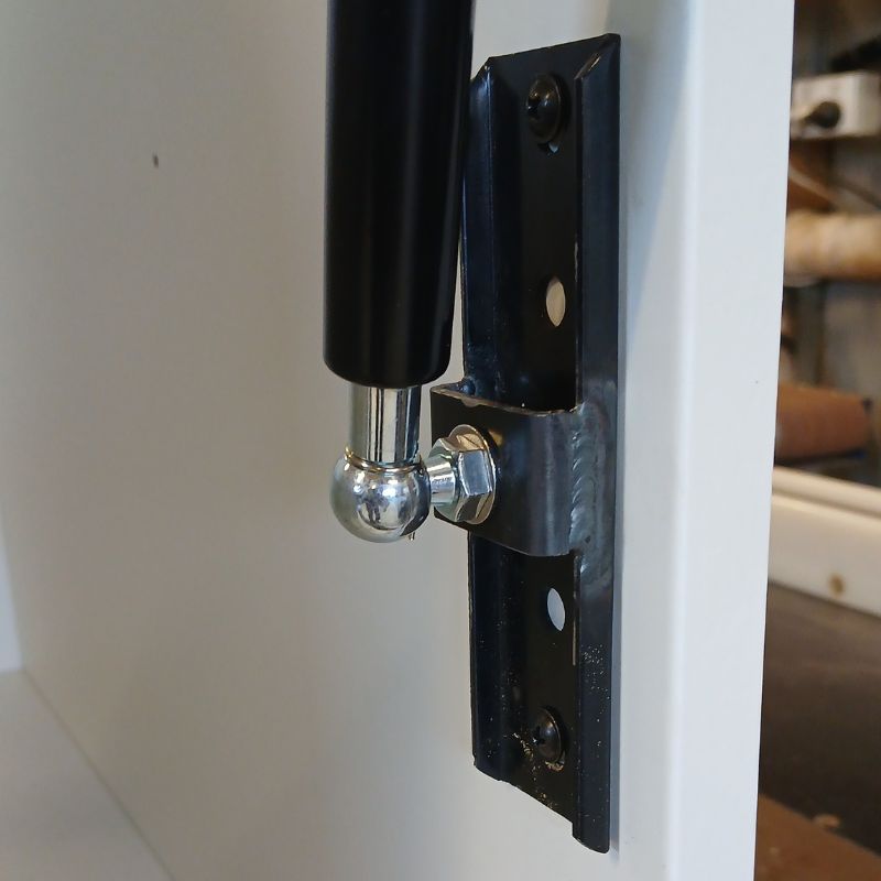 Now with a welder and grinder in hand, combined with a few off cuts of random pieces of steel found in my shed leftovers bin, I fashioned up some brackets for the gas struts. After a bit of optimizing and trying different load points, I tuned the bench top to hold its own weight in mid-air, while also not pushing so far upwards that it wanted to lift the feet off the floor when the legs are out.