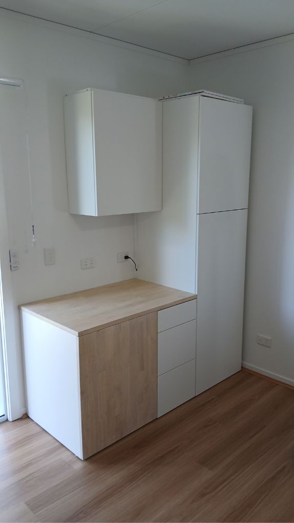 Once the flip out table was finished up in the shed. The finishing technique on the bench top being a light lime wash before two coats of hardwax oil to stop the timber from yellowing. It was time to put it all together and fit it onto the rest of the flat packs in the room.
