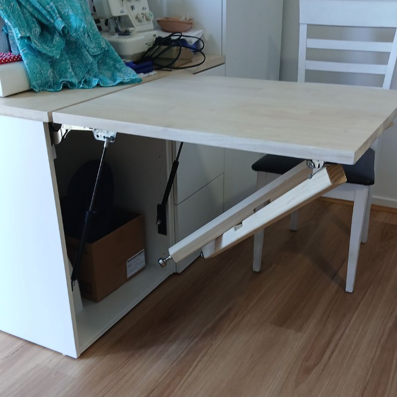 I knew I was going to face some challenges with the flip out table-top. With the biggest challenge being to make it sturdy enough to be able to use a sewing machine on, and at the same time be user-friendly enough that it can easily be lifted out and put away with minimal strength required.