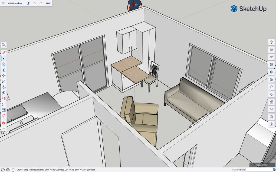 I modeled the entire flat in SketchUp and proposed 4 different design ideas and orientations for the craft corner and TV wall.