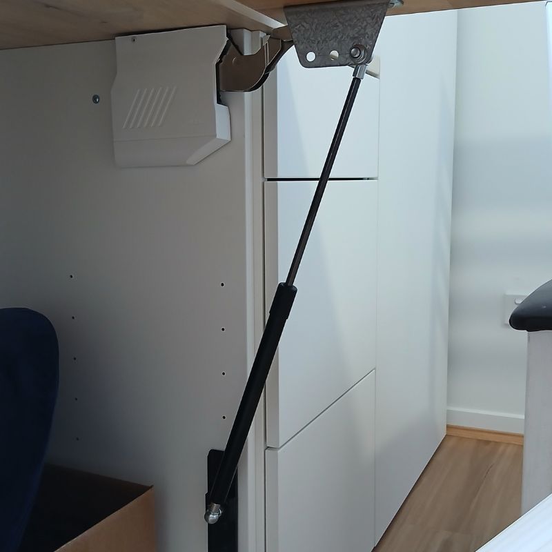 This leg design posed another challenge in that while the legs were being opened or stayed, all the weight of the solid timber bench would be placed upon the operator. This was unacceptable. But if I include gas struts fitted into the design, it would be able to hold the weight of the bench top while the legs were being locked into place.