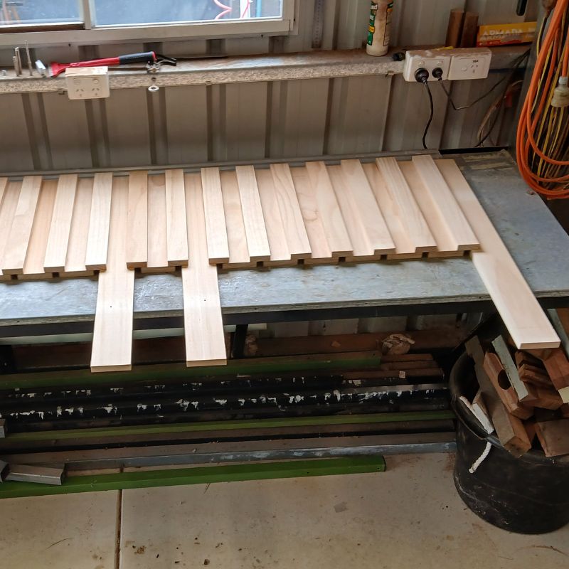 The Macadamia planks were too short to be able to span the king bed in only two pieces, so I designed the top piece to be three pieces.